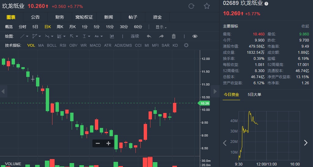 截至8月1日,玖龙纸业跌0.36%,报16.44港元。