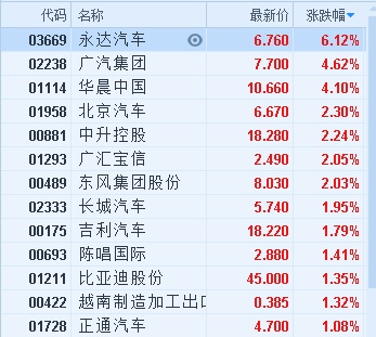 智通财经APP获悉,汽车股普遍上扬,截至11时46分,永达汽车(03669)涨6.12%,报6.76港元,广汽集团(02238)涨4.62%,报7.7港元,华晨中国(01114)涨4.1%,报10.66港元,北京汽车(01958),中升控股(00881)涨逾2%,长城汽车(02333),吉利汽车(00175),比亚迪股份(01211)涨逾1%。