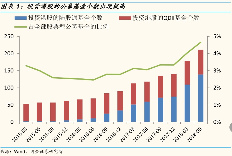 截至2018年7月27日,境内投资港股的公募基金共有211支,其中陆港通基金139只,较1季度的109支提高了27.52%;QDII基金72只,较1季度的70支提高了2.86%。投资港股的基金个数占全部股票基金总个数的比例由4.04%上涨至4.66%。
