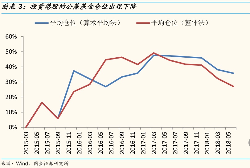 截至2018年7月27日,境内投资港股的公募基金平均仓位(算术平均法)由38.16%下降至35.78%;平均仓位(整体法)由32.33%下降至27.06%。