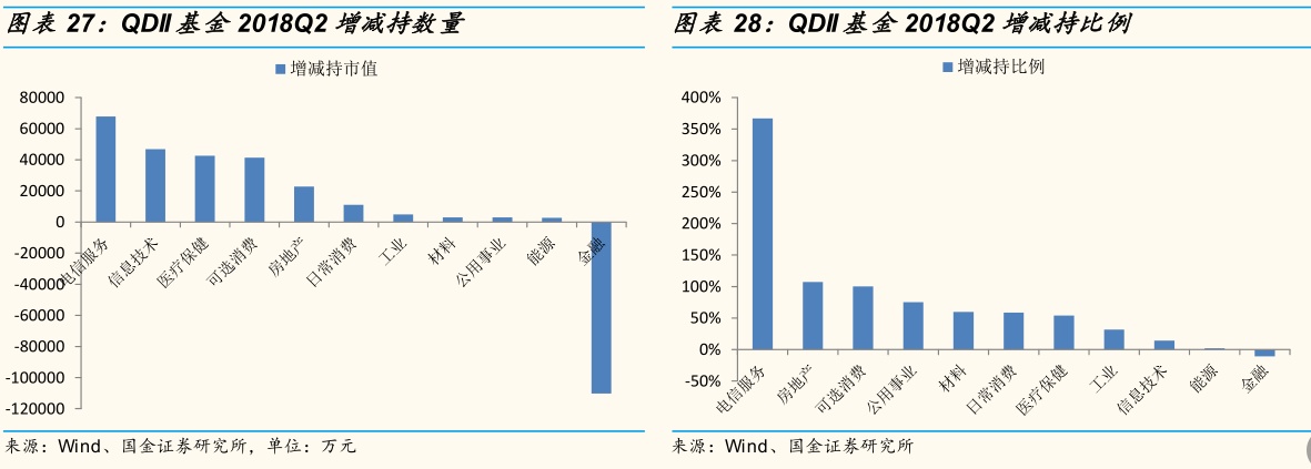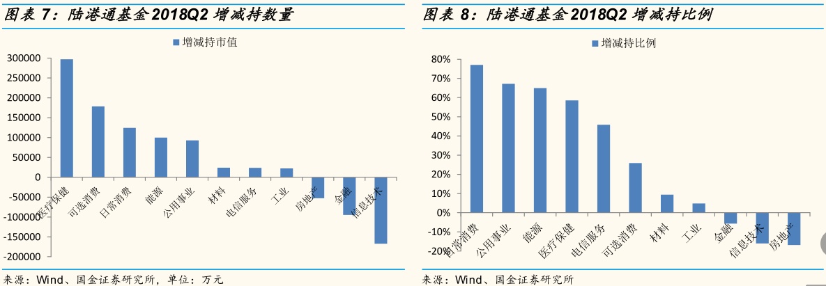 陆港通基金与QDII基金在Q2均减持了大量的金融股,其中QDII减持的比例更大;同时均增持了大量的医疗保健行业。