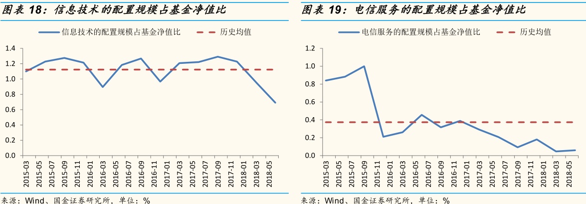 成长:信息技术与电信服务也处于明显的低配状态,二者的配置比例均显著低于历史均值水平。