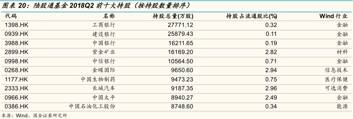 按照持股数量来排序,2018Q2陆股通基金持仓前十的个股分别为:工商银行、建设银行、中国银行、紫金矿业、中信银行、金蝶国际、中国生物制药、长城汽车、中国太平、中国石油石化股份。