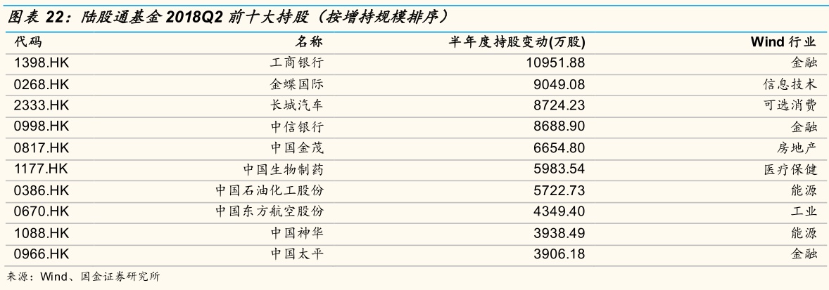 按照增持规模来排序,2018Q2陆股通基金增持前十的个股分别为:工商银行、金蝶国际、长城汽车、中信银行、中国金茂、中国生物制药、中国石油化工股份、中国东方航空股份、中国神华、中国太平。