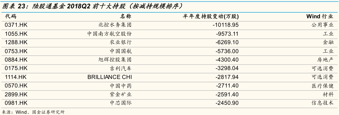 按照减持规模来排序,2018Q2陆股通基金减持前十的个股分别为:北控水务集团、中国南方航空股份、农业银行、中国国航、旭辉控股集团、吉利汽车、BRILLIANCE CHI、中国中药、紫金矿业、中芯国际。