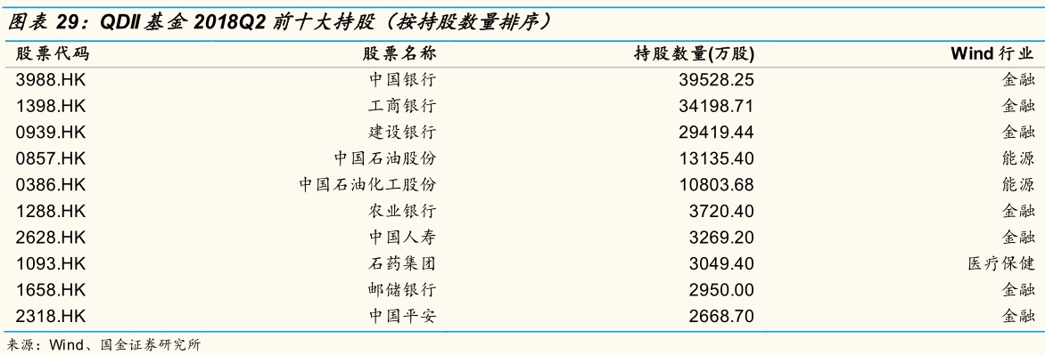 按照持股数量来排序,2018度二季度QDII基金持仓前十的个股分别为:中国银行、工商银行、建设银行、中国石油股份、中国石油化工股份、农业银行、中国人寿、石药集团、邮储银行、中国平安。