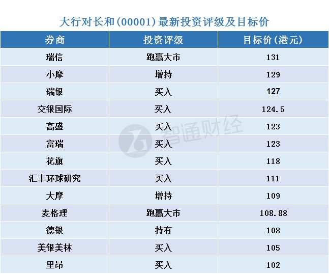 智通财经APP整理,大行对长和(00001)最新投资评级及目标价如下:
