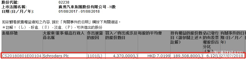 施罗德投资增持广汽(02238)437万股 涉资3068万元