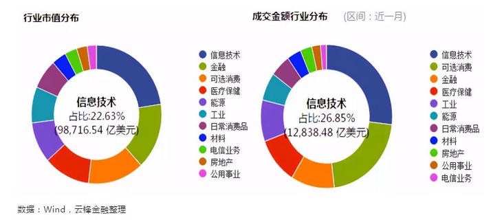 科技股在美股中占比举足轻重、今非昔比。标普500指数中,信息技术行业市值占比最大,超过22%,远超过排在第二的金融(占比15.43%)和第三的可选消费行业(占比达13.96%)。可以说,科技股的涨跌牵动整个美国股市。
