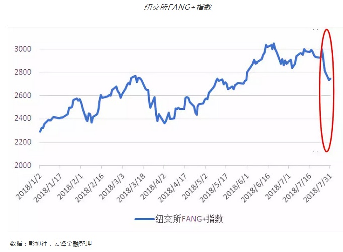 7月25到7月30日,纽交所FANG+指数大跌8.95%,投资者开始对科技板块表现出恐慌。Facebook在公布财报后,股价下跌超过24%;奈飞遭到评级下调;而谷歌因欧盟反垄断条款的出台,遭受43.3亿欧元的天价罚单,净利润腰斩。