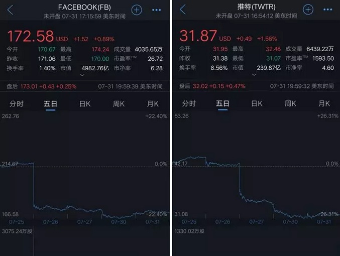 在回撤大潮中,两家龙头公司的表现让人大跌眼镜。Facebook的市值蒸发是因为最近公布的财报显示营收不及预期,而Twitter则是因为其用户数量的减少。在一个交易日,Facebook和Twitter的市值分别下降了五分之一。眨眼间,1300亿美元蒸发殆尽。