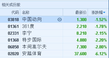 智通财经APP获悉,体育用品股全线下挫,板块跌幅达4.93%,其中安踏体育(02020)跌幅列居榜首,截至10时40分,跌6.24%,报价37.55港元,成交额1.34亿。