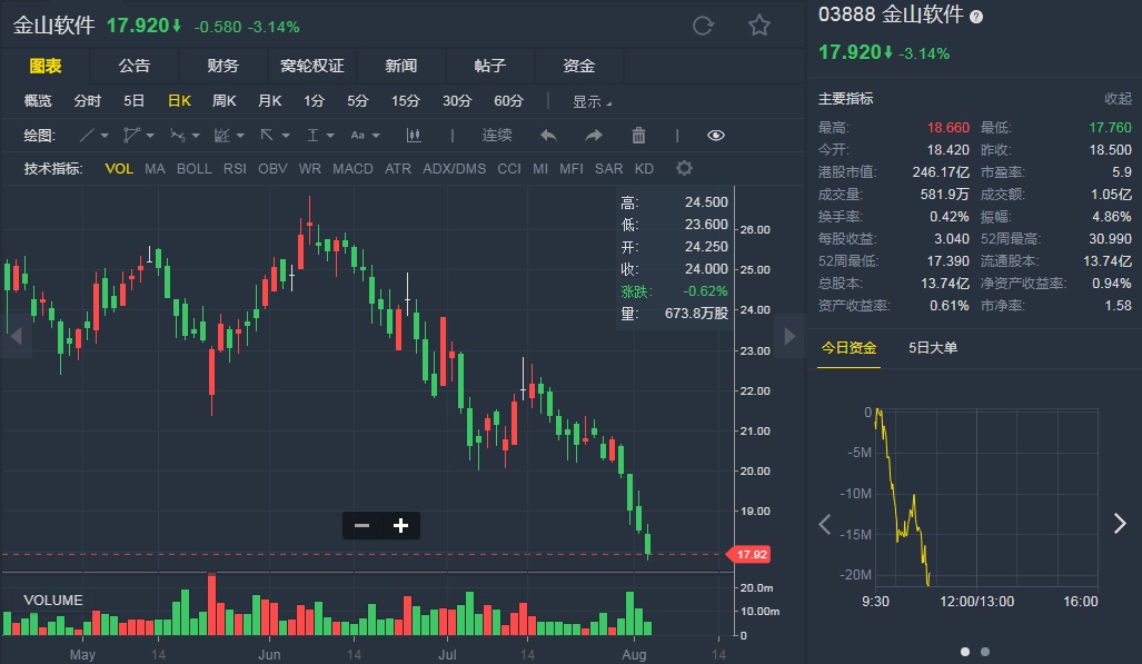 截至8月2日,金山软件跌3.14%,报17.92港元。