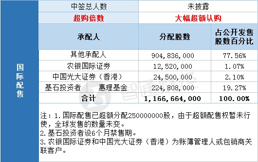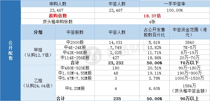 其中,公开配售申购人数23467,一手中签率100%,超购倍数18.37倍。