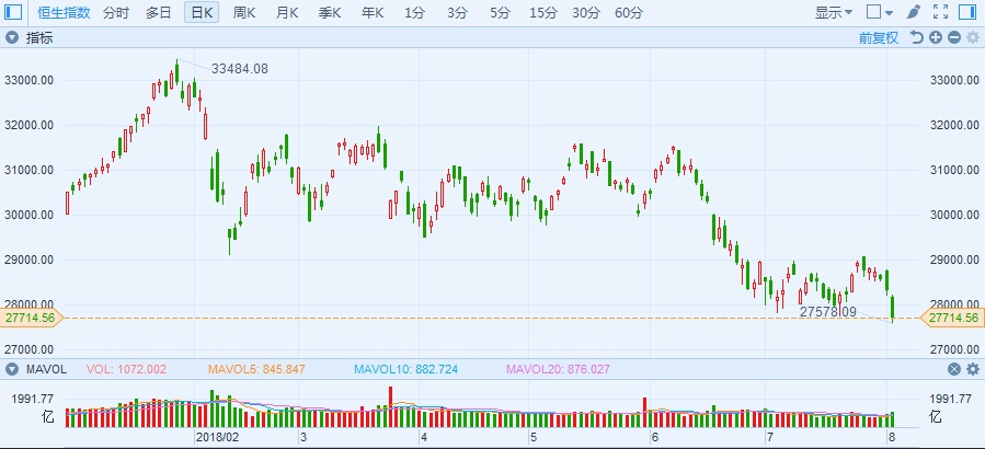 市场担忧中美贸易战存在升级可能,恐慌情绪升温,港股暴跌。恒生指数盘中大跌点762.65点或2.69%,低见27578.09点,创年内新低。截至收盘,恒生指数跌幅略微收窄,跌626.18点或2.21%,报27714.56点,成交额放大至1072亿港元。