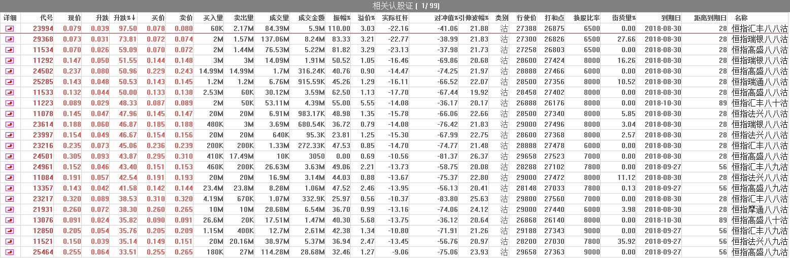 据智通财经APP统计,截至目前,市场上共有252只恒生指数认股证,99只为认沽证,96只出现上涨,最低涨幅为10.45%。其中有29只恒指认沽证,涨幅超30%;7只恒指认沽证,涨幅超过50%;1只恒指认沽证,涨幅超过90%。