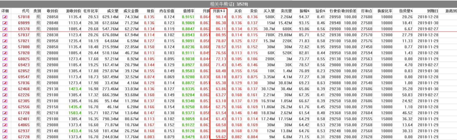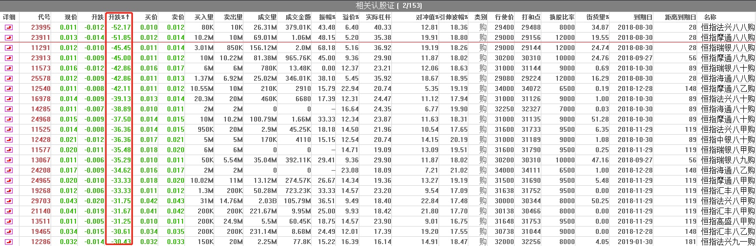 因此,如果没有把握好大市方向,选择了认购证的投资者可能就要“老乡见老乡,两眼泪汪汪”。据智通财经APP统计,恒生指数共有153只认购权证,91只出现下跌,最小跌幅为6.25%。其中22只恒指认购证,跌幅超过30%;2只恒指认购证,跌幅超过50%。