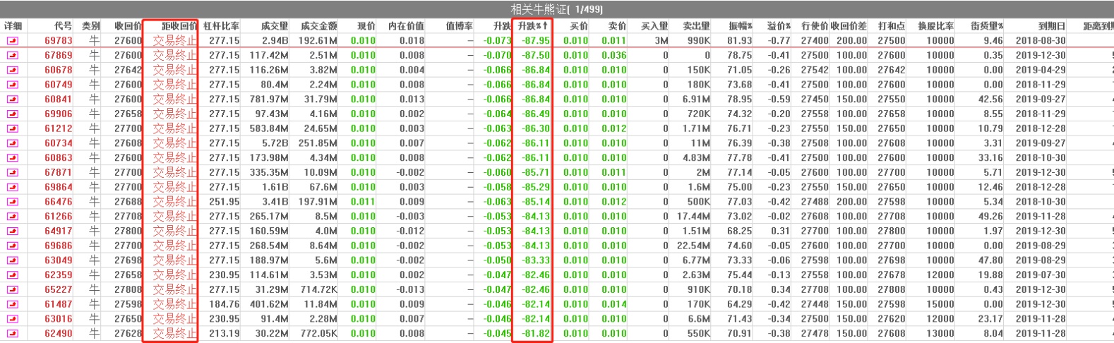 牛证作为看好后市一种投资工具,在大市下挫中则要承受损失,还会面临被强制收回的情况。据智通财经APP统计,恒生指数的牛证共有499只,464只出现跌幅,最小跌幅为7.35%,最大跌幅为87.95%。尴尬的是,今天有91只恒指牛证被强制收回,终止交易。