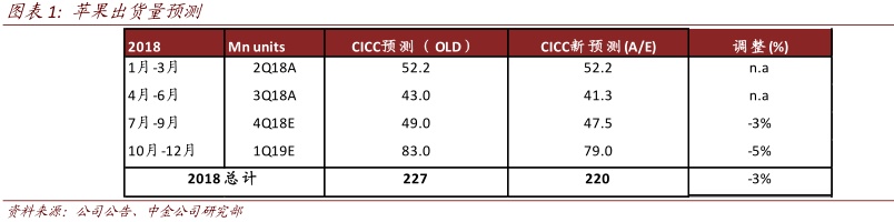 本季iPhone出货4130万台,符合市场预期4181万台,低于4200-4400万台的预测。近期我们跟踪全球手机产业链公司业绩,普遍对下半年市场展望偏谨慎,因此我们将FY4Q18/1Q19季度出货量下调3%/5%至4750/7900万台,全年从2.27亿台小幅下修3%至2.20亿台。我们仍谨慎看好下半年苹果产业链,持续推荐受益个股。