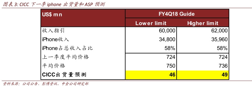 公司指引四到六月季度收入600-620亿,同比增加14~18%环比增长14-16%下限高于此前的市场预期。根据我们测算,这个指引对应iPhone总出货量4600-4900万,符合此前市场4700万台的预期。