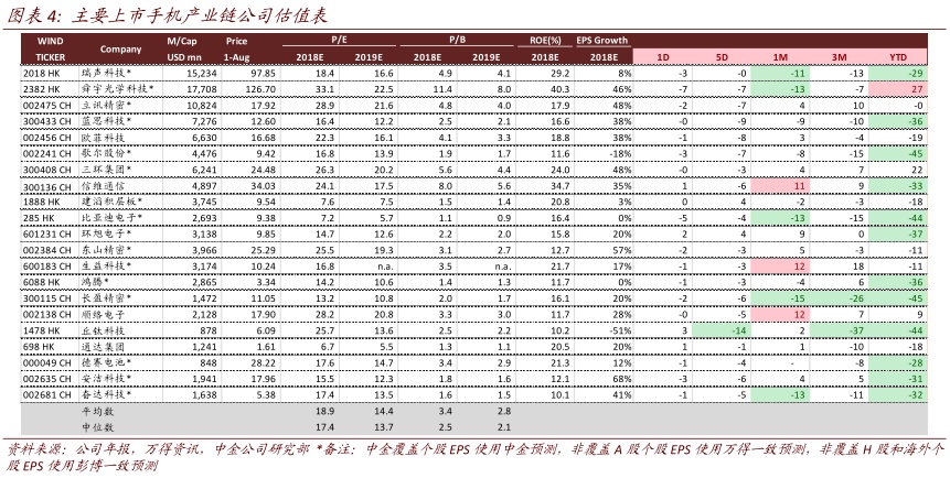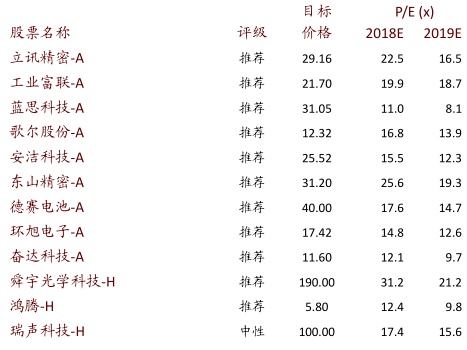 目前A/H股产业链的平均市盈率为19倍,尽管部分行业竞争加剧,我们仍谨慎看好苹果产业链,随着新一代iPhone的发售及Apple watch、Air Pod的放量,将持续利好立讯、歌尔、蓝思等受益标的。