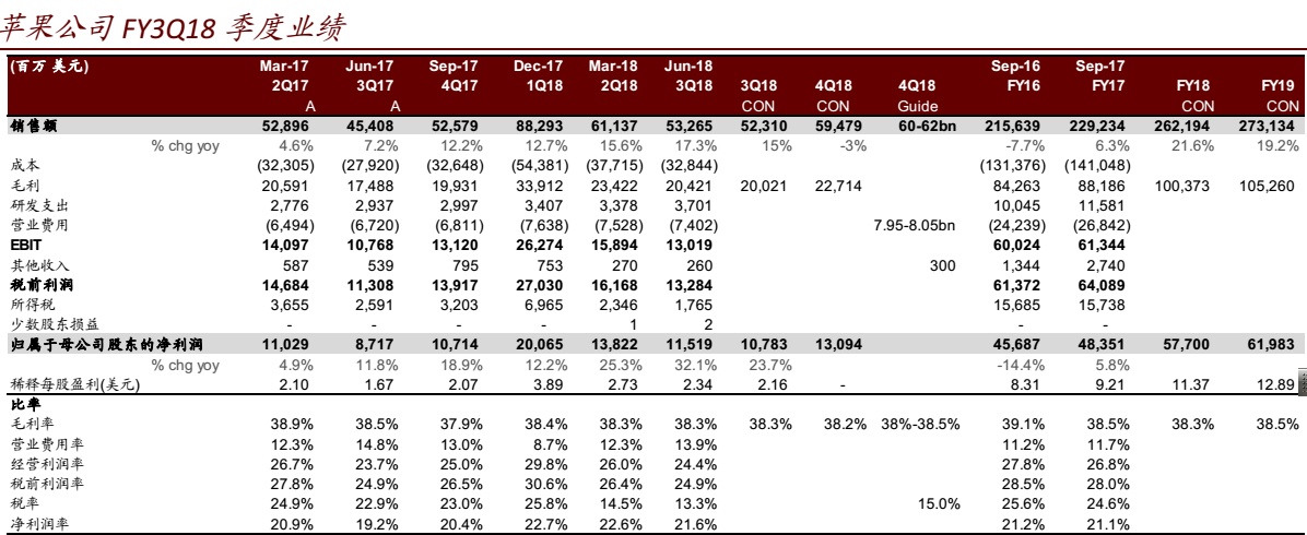 今日凌晨,苹果发布FY3Q2018(4-6月)季度报告。当季营收533亿元,同比增长17%,净利润115亿元,同比增长32.1%,收入和利润均高于市场预期。公司同时指引四到六月季度收入600-620亿,高于此前的市场预期。