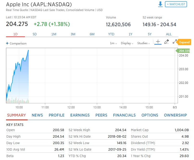 智通财经APP获悉,苹果自7月31日晚公布超市场预期的业绩后,股价就不断向上。8月2日晚,美股开盘不久后,苹果就实现了市值首次超过1万亿美元。之后苹果股价仍不断向上,截至北京时间22:23分,苹果股价涨1.38%,报204.275美元,市值达10040亿美元。