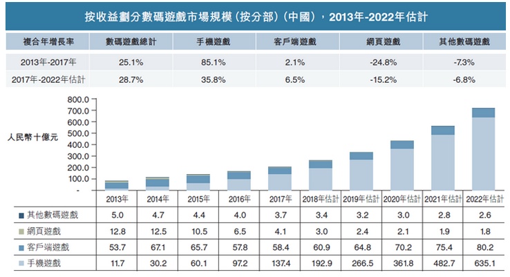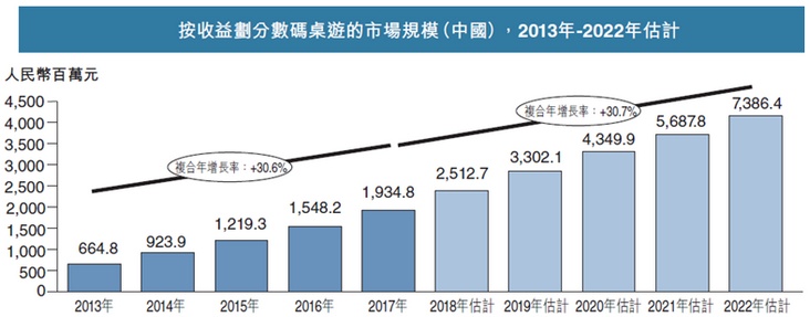 随着计算机及互联网技术的进步,部分数码游戏已开发成复制原桌面游戏。其中,2013-2017年市场规模年复合增长率达到30.6%,预计2017-2022年增长势头将获得持续,年复合增长率为30.7%。