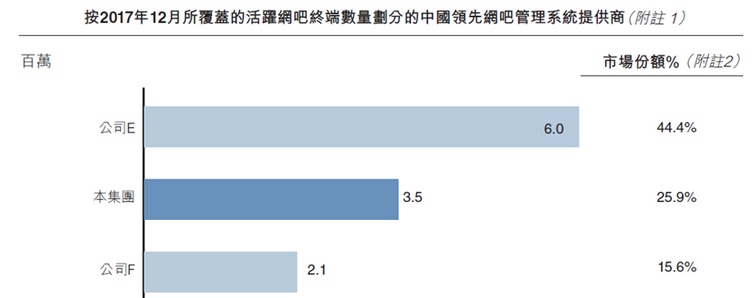 2017年12月,我国活跃网吧终端总数为1350万,行业排名第一其覆盖量为600万,市场份额为44.4%。公司覆盖量为350万,市场份额达25.9%,自2015年进入市场的后来者,实现惊人扩张,快速超越自2006年就开始进入网吧营运市场的公司F,在中国所有网吧业务管理系统供应商中排名第二。
