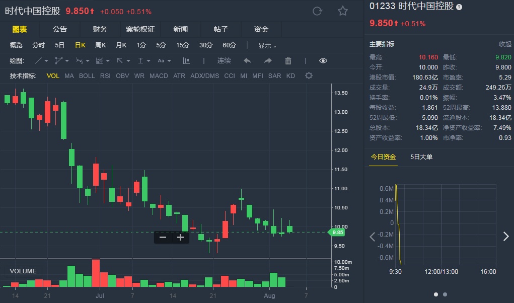 截至8月3日,时代中国涨0.51%,报9.85港元。