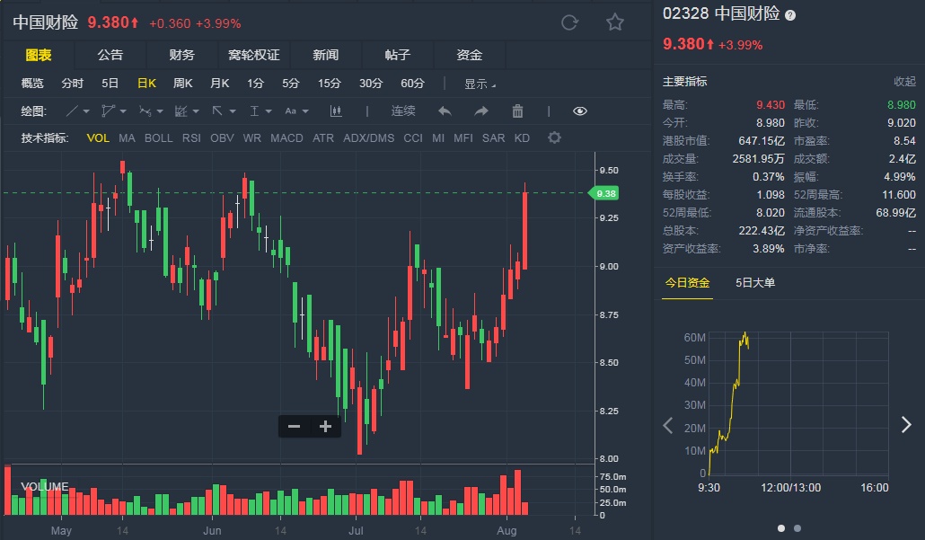 截至8月3日,中国财险涨3.99%,报9.38港元。