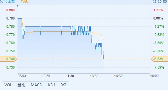 智通财经APP获悉,国美零售(00493)预期上半年亏损3.8亿元至4.8亿元人民币,受业绩不佳影响,公司股价今日走弱。截至14时03分,该股跌6.33%,报价0.74港元,成交额5112万港元。