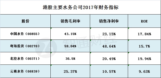 从销售毛利率及净利率来看,这两项指标表现最强的是粤海投资(00270)及中国水务,主要因为其主要业务为供水业务,但是中国水务总供水能力较粤海投资低不少,因此其指标还赶不上粤海投资,但已远远高出云南水务(06839)。