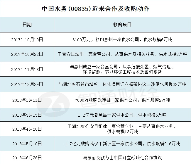 智通财经APP了解到,从2017年10月份到2018年6月份,短短的9个月时间里,中国水务共完成了9笔收购动作及战略合作,这些都将为公司未来业绩增长夯实基础。