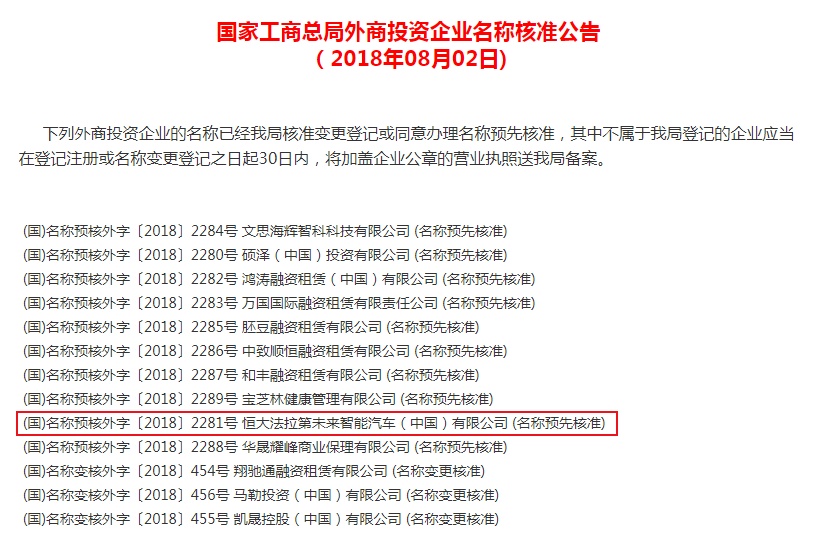 智通财经APP获悉,8月2日,工商总局发布公告,恒大法拉第未来智能汽车(中国)有限公司名称获工商局核准。