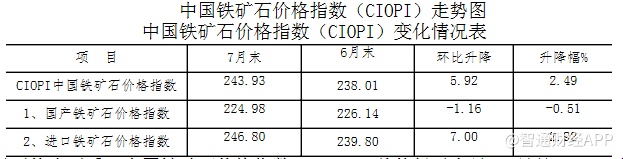 据钢铁协会监测,7月末,中国铁矿石价格指数(CIOPI)为243.93点,环比上升5.92点,升幅为2.49%。其中:国产铁矿石价格指数为224.98点,环比下降1.16点,降幅为0.51%;进口铁矿石价格指数为246.80点,环比上升7.00点,升幅为2.92%。(见下图、表)