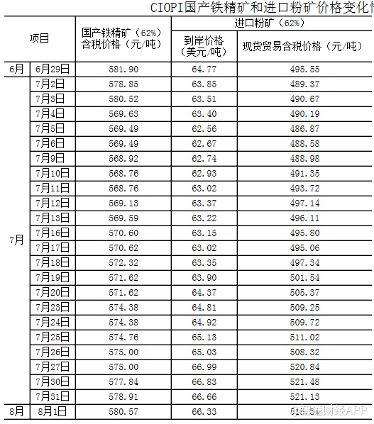 7月末,CIOPI国产铁精矿含税价格为578.91元/吨,环比下降2.99元/吨,降幅为0.51%,环比降幅收窄0.13个百分点;CIOPI进口粉矿到岸价格为66.66美元/吨,环比上升1.89美元/吨,升幅为2.92%,环比升幅扩大2.14个百分点。(见下图)