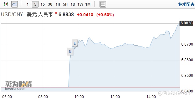 此外,在岸人民币今日跌幅已超400点,跌破6.88关口。现报6.8838,跌410点或0.6%。
