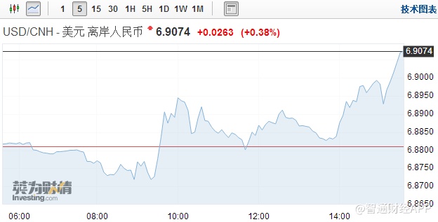 智通财经APP获悉,离在岸人民币午后急跌,离岸人民币日内波幅超300点,跌破6.9关口,创2017年5月以来新低。截至发稿,现报6.9074,跌263点或0.38%。