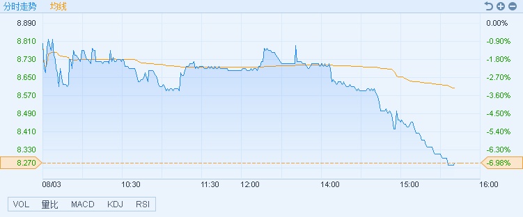 截至15时39分,潍柴动力(02338)跌6.97%,报价8.27港元,成交额2.14亿。