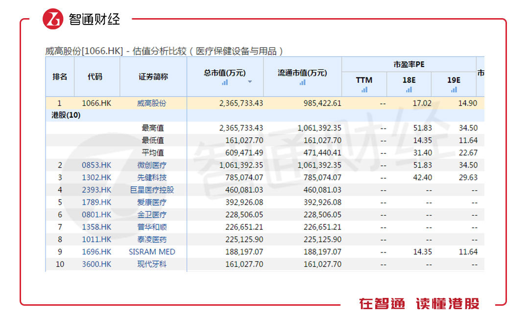 数据显示,威高股份2018年的PE较平均值31.4倍足足低了近14个点。静态PE甚至比市值才14亿港元的春立医疗(01858)还低4倍,更不用提动作50倍起的微创(00853)、先健科技(01302)了。