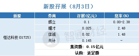 截至8月3日,正在招股的新股中,辉立、耀才、信诚3家券商为恒达科技(01725)借出孖展金0.145亿港元,认购近足额。具体情况如下: