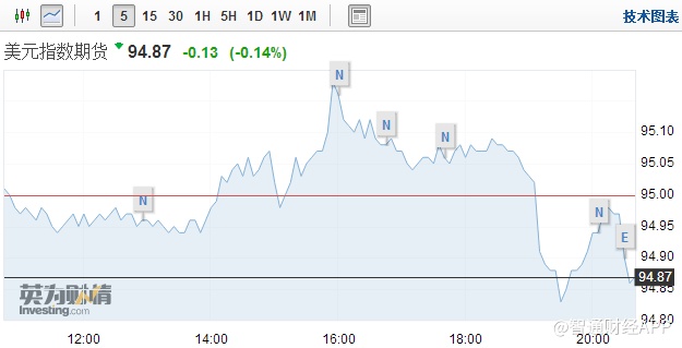 数据公布后,美元出现短线下跌,现报94.87,跌0.13或0.14%。