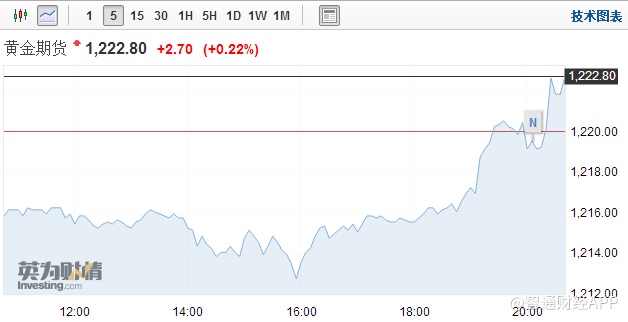 黄金期货出现短线上扬,现报1222.8,涨2.7或0.22%。