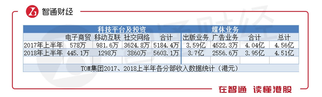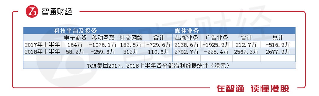 但细看公司业务,亏损资产甩卖已有所成效。TOM集团的业务分为科技平台及投资、媒体业务两大板块,2018年上半年,科技平台及投资的收入为5603.1万港元,同比增长8%,主要得益于移动互联、社交网络的增长,电子商贸收入则有所下滑。