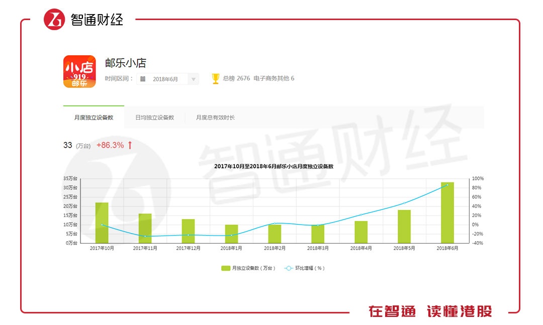 据智通财经APP观察,邮乐网旗下的邮乐小店自2017年10月开始,月度独立设备数便逐月下滑,从22万台直接腰斩至今年1月份的10万台。