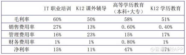 由于中国普遍重视学历文凭,再加上招生数量比较固定,高等学历教育及K12学历教育在招生上基本不需要推广,因而也不会产生成本,销售费用率自然远低于偏重营销模式的IT职业培训及K12课外辅导,甚至可以视为没有。