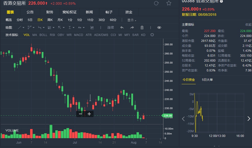 截至8月6日,港交所(00388)涨0.89%,报226港元。