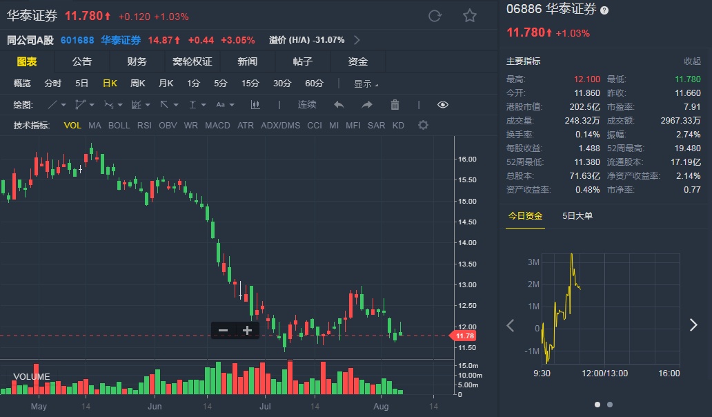 截至8月6日,华泰证券(00743)涨4.39%,报6.42港元。