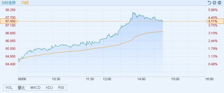 智通财经APP获悉,长和(00001)领涨蓝筹,中期业绩符合市场预期,截至14时44分,涨4.11%,报价87.45港元,成交额7.16亿。